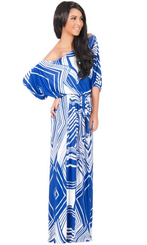 Koh Koh One Shoulder 3/4 Sleeve Graphic Print Long Versatile Cocktail Evening Maxi Dress - Medium - Saphire & White
