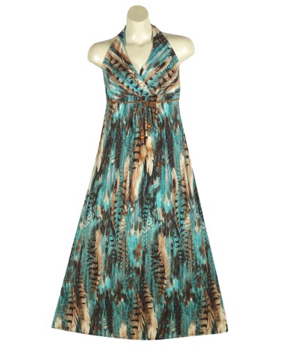Description : Silky halter top maxi dress has a vibrant feather print, empire waist, and thin rope belt with wood look beading and feather trim. Bust is lined, skirt is not. Back waist is elastic.