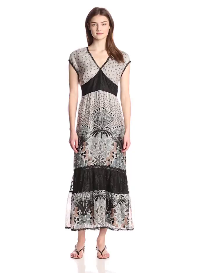 Description : This Anna Sui maxi dress is complete with all the bells and whistles- tiered layers, mixed prints, and lace trim